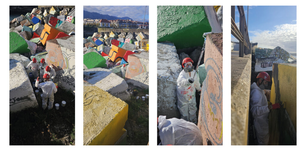 En esta nueva fase de restauración de los Cubos de la Memoria, Mohamed y Diego forman parte del equipo de SABBIA Restauración, trabajando codo con codo con el muralista Carlos Adeva, quien dirige la intervención con una mirada respetuosa hacia la obra original.